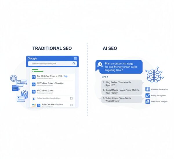 The difference matters because user behavior is shifting. Instead of typing a keyword into Google and clicking through 10 results, users now ask ChatGPT a question and get one direct answer. If your brand isn’t in that answer, you’re invisible to a growing segment of your audience.